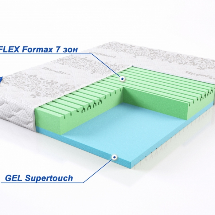 Верхняя часть матраца – слой высотой 5см GEL Supertouch. Высокоэластичная пена с эффектом памяти. При контакте с телом человека реагирует на его температуру, повторяя контуры тела с точностью до миллиметра. Входящий в структуру GEL увеличивает уровень эластичности матраца и одновременно служит терморегулятором.