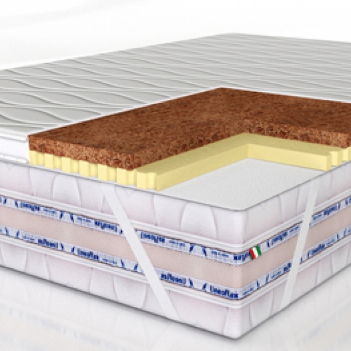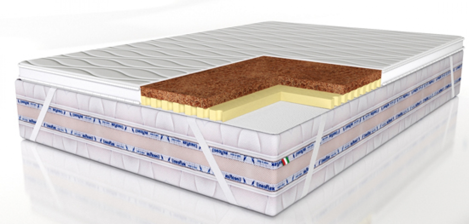 Латексированная кокосовая койра представляет собой пропитанные латексом (латексированные) термоскреплённые плиты. Высокое содержание латекса (50%) обеспечивает материалу упругость и устойчивость к нагрузкам. Экологичность, природная эластичность и хорошая воздухопроницаемость плит из кокосового волокна делают поверхность изделия жёсткой и упругой. Высота слоя - 3 см.