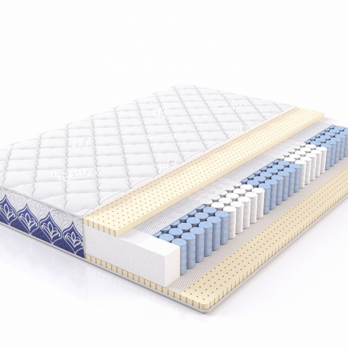 Эргономический матрас с 5-ю зонами поддержки. Высокие анатомические свойства пяти зонального блока независимых пружин усиливает использование в качестве мягкого наполнителя слой натуральной латексной пены самого комфортного компонента матраса.