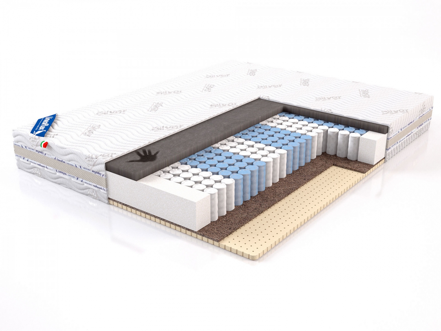 Наполнение: 1см конский волос+3 см латекс/блок независимых пружин с 5 зонами поддержки/4 см пена Memory.
