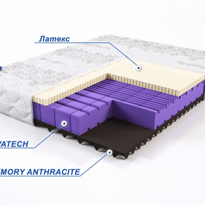 Наполнение: 4 см высокоэластичная пена повышенной плотности с эффектом памяти MEMORY anthracite, цвет черный/ полеуритановая пена на водной основе EVATECH c 7-ю зонами поддержки, цвет фиолетовый/5 см латекс.