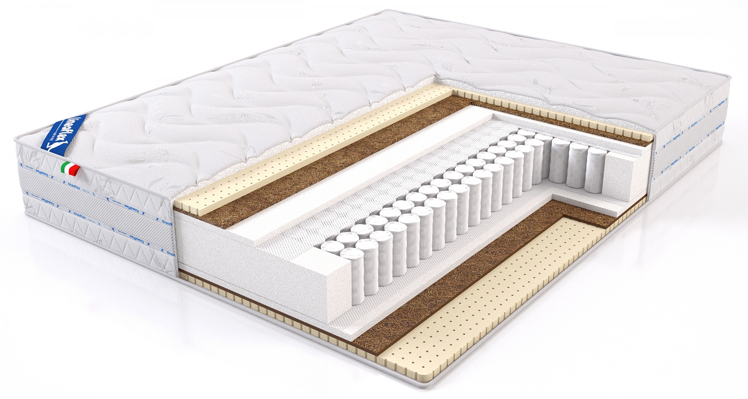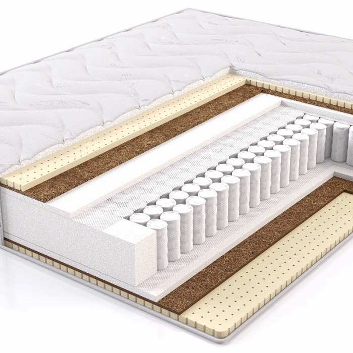 Наполнение: 2 см пена Ergoflex+1 см кокос+2 см латекс/блок независимых пружин/2 см пена Ergoflex+1 см кокос+2 см латекс.